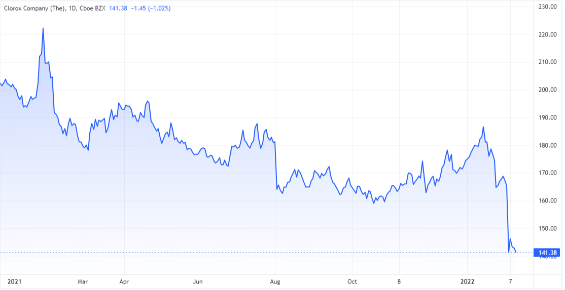 CLX ended at $141.38, down 1.02%. The stock is down 21.27% in the last month.