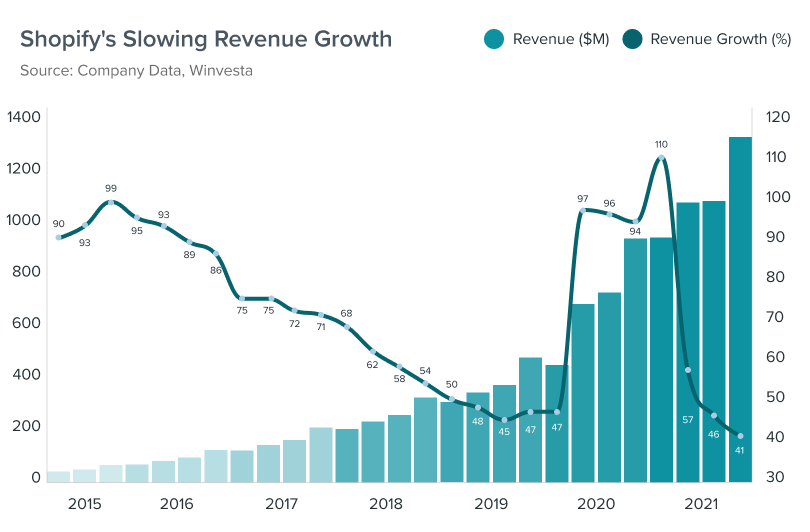 With the gains seen in its shares late last year, it stands to reason that Shopify was priced, so there was no room for error. Just imagine: for the four quarters from Q2 2020 to Q1 2021, the company reported revenue growth of 97%, 96%, 94%, and 110%. In the last three quarters, that number has come down to 57%, 46%, and in the most recent quarter, 41%.
