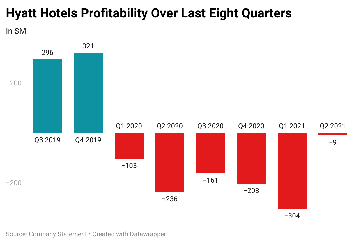 Hyatt, along with its brethren, witnessed dropping revenues while operating costs remained more or less constant. To stem the bleeding, Hyatt laid off over 1K employees globally in May last year and explored restructuring its debt.