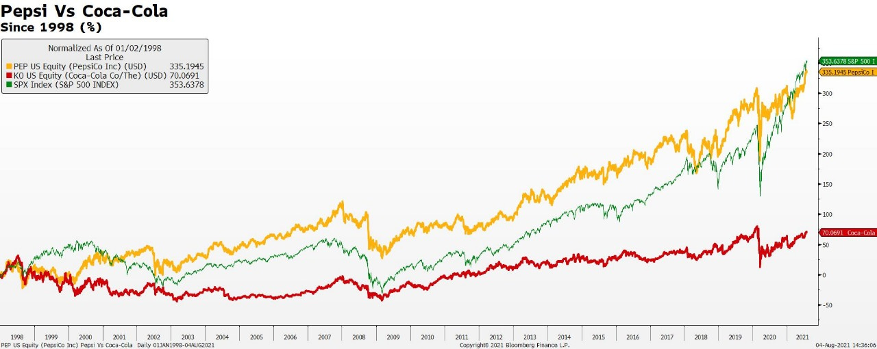 Coca-Cola (KO) and PepsiCo have been at each other's throats forever - each trying to outdo the other although, in terms of revenue, PepsiCo has been the clear leader. In the mid-90s, under then CEO Roger Enrico, PepsiCo spun off Pizza Hut, KFC, and Taco Bell, and brought the snack business under the Frito-Lay umbrella. And then in 1998, it acquired Tropicana for $3.3B in cash.