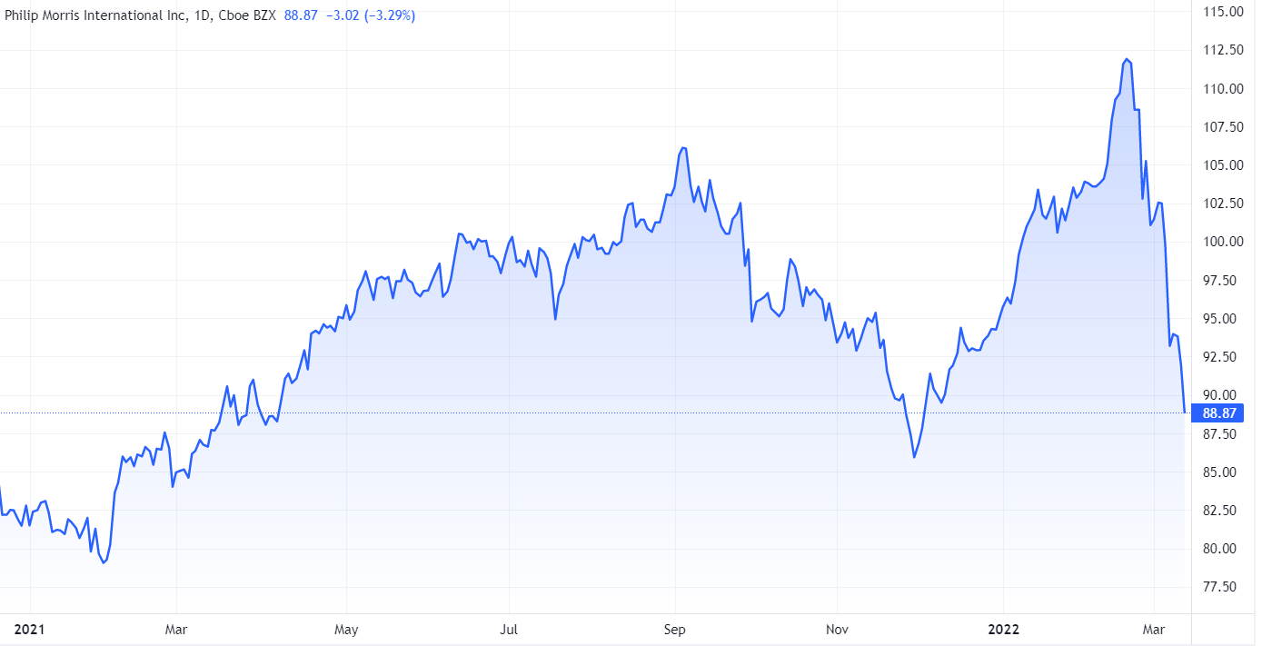 Shares of Philip Morris are down 12% since the start of the month. Given the retreat from Russia, it will now have to look for alternate revenue sources to make up for the shortfall. Unfortunately, the Russian Roulette has only just begun, and thereâs more yet to unfold.