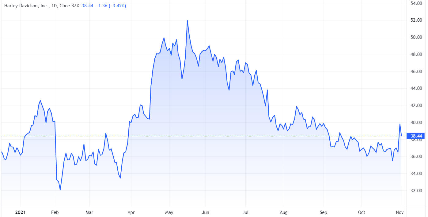 HOG ended at $38.44, down 3.42% after Monday's 8% jump.