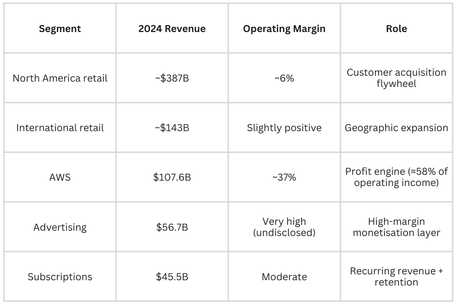 Amazon doesn’t make most of its money from a single business anymore. It makes money across four distinct engines—each with different growth trajectories, margin profiles, and competitive dynamics.