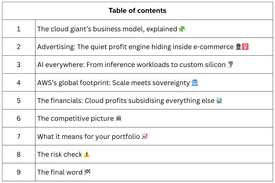 Everyone thinks Amazon is an e-commerce company that happens to run servers. It’s not. It’s the dominant cloud infrastructure company that subsidises a retail and media empire—backed by custom AI silicon, a digital advertising business rivalling Google’s, and a logistics network no competitor can replicate. AWS generated $107.6 billion in revenue in 2024, accounting for roughly 58% of Amazon’s total operating income despite representing only about 17% of revenue. The retail operation—$638 billion in total sales—exists primarily to feed the flywheel: acquire customers, convert them to Prime, monetise them through ads, and funnel enterprise relationships into AWS contracts. That combination makes Amazon the most structurally embedded company in the global economy. Here’s why the real story isn’t the online shop—it’s the plumbing underneath.