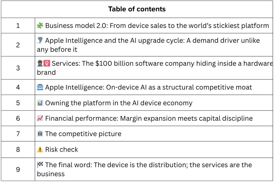 In other words, “Apple” is now a recurring-revenue platform with a high-margin software engine, AI infrastructure embedded in its chips, and hardware that functions primarily as a distribution mechanism, not the iPhone company clinging to upgrade cycles.