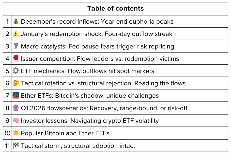 This article dissects the flow reversal, macro triggers, issuer competition, and what January’s redemption cascade means for crypto ETFs entering their second year of trading.