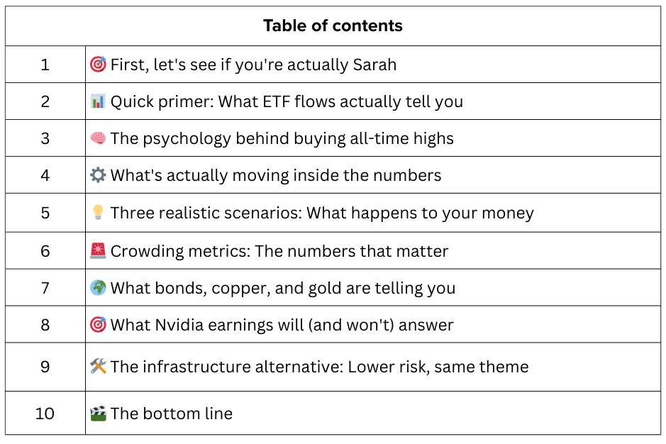 Historical parallel: In early 2000, tech funds saw extreme inflows while trading at all-time highs. Within months, the Nasdaq peaked and began a 78% decline over the next two years. (No, we’re not predicting that. But the pattern—peak prices + peak inflows + peak optimism—rhymes uncomfortably.)