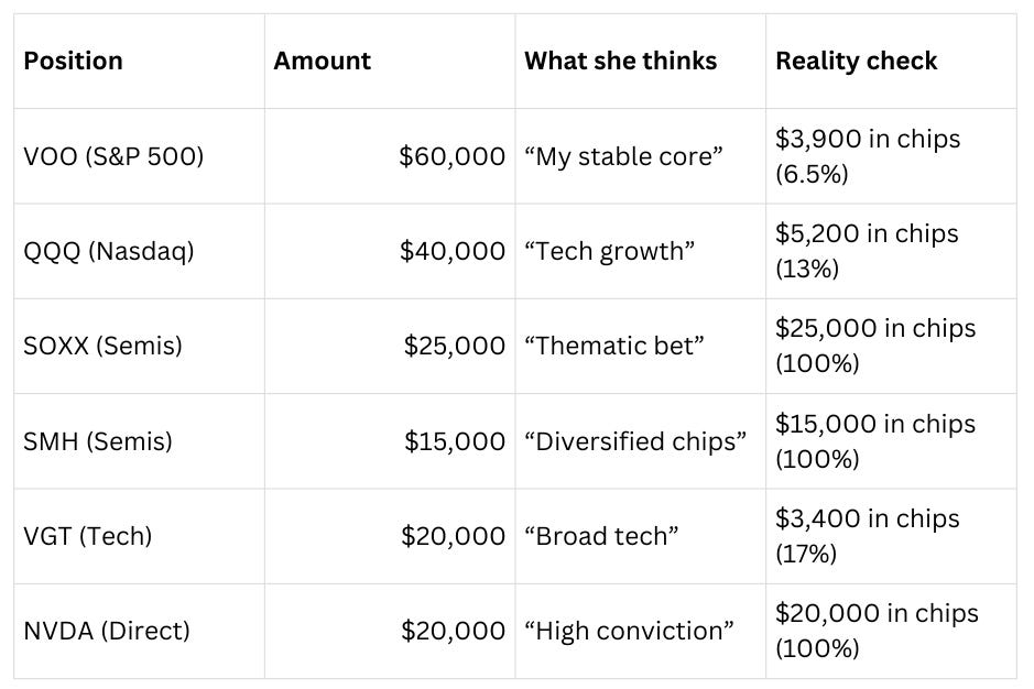 She’s been building positions thoughtfully for the past year. She reads financial news, diversifies across “different” ETFs, and considers herself a disciplined long-term investor. Here’s what she owns: