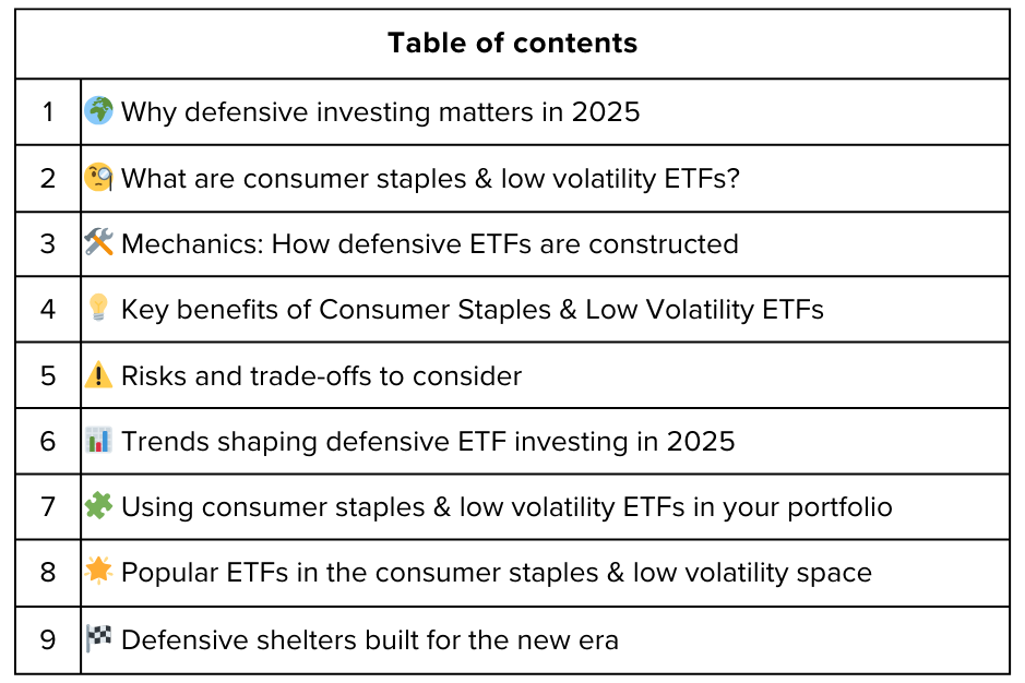 In the stormy sea of financial markets, defensive investing has resurfaced as a central strategy for 2025. With geopolitical uncertainty, inflation aftershocks, and shifting central bank signals, investors are once again prioritizing stability and resilience. Consumer Staples and Low Volatility ETFs, classic defensive choices, are enjoying renewed interest as reliable, accessible shelters for portfolios. These funds promise smoother returns, consistent dividends, and a buffer against market cycles. In this article, we revisit these defensive themes, explore their mechanics, advantages, risks, and spotlight the ETFs leading this sector into the future.