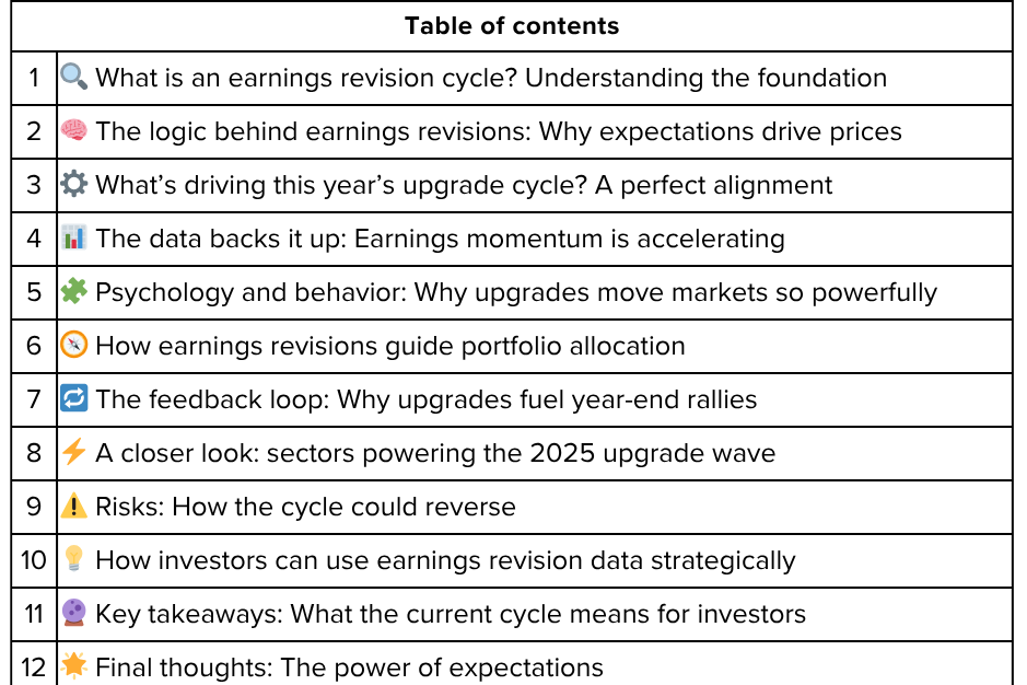 As 2025 enters its final quarter, global equity markets are enjoying a surprising year-end rally. Inflation is easing, central banks appear to have paused rate hikes, and optimism about earnings has surged. One powerful but often overlooked driver behind this upswing is the earnings revision cycle—a wave of analyst upgrades that reflects improving profit expectations across sectors.