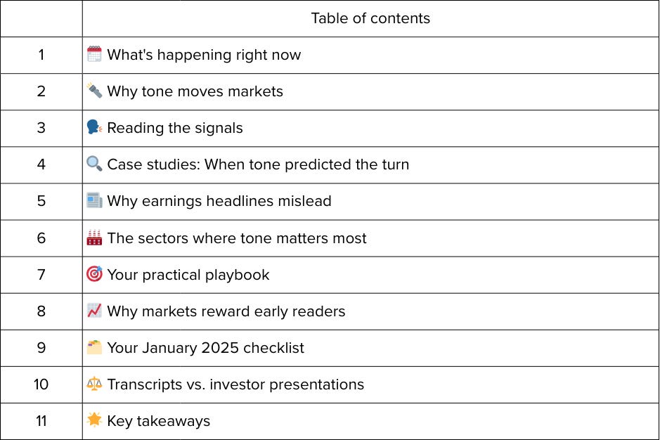 The pattern? The tone changes before the numbers do. And January earnings seasons are particularly revealing because Q4 results include holiday demand data that management uses to project the entire coming year.