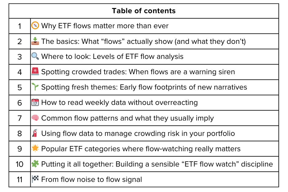 ETF flows have become one of the cleanest “tells” in modern markets. Prices tell you what has happened; flows hint at where capital is moving now. Late in the cycle, when narratives shift quickly and headline noise is constant, learning how to read weekly ETF flow data can help distinguish crowded consensus trades from genuinely emerging themes, and avoid being the last buyer into a hot idea.