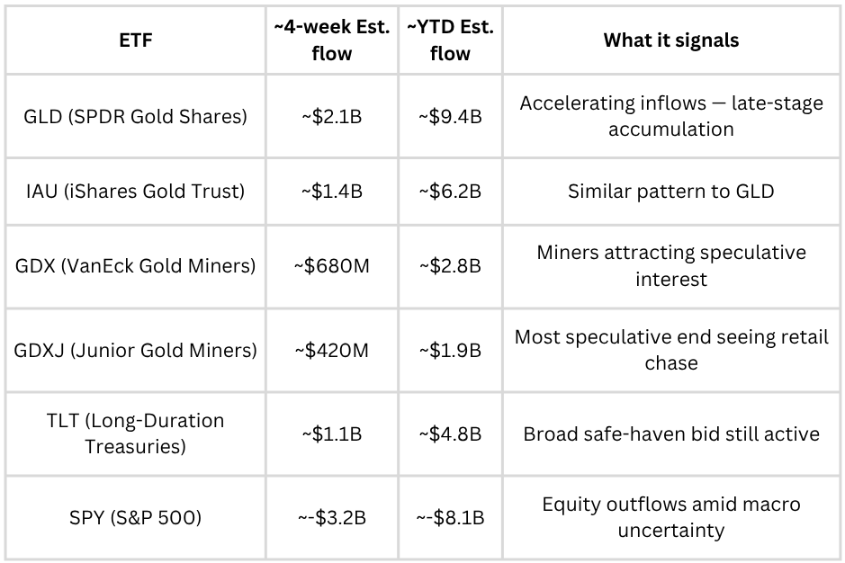 Here’s the pattern that should give you pause: GLD and IAU absorbed more capital in the past four weeks than in many full quarters of 2025. That’s not institutional accumulation. That’s institutional completion — meaning the investors who positioned six to nine months ago are now quietly distributing shares to the investors who just read a Bloomberg headline.