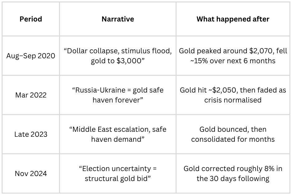 But here’s the cognitive trap: all of those arguments were also true twelve months ago, when gold was trading around $3,300 — well before this latest leg higher. The commodity didn’t change. The structural story didn’t change. What changed is that the price surged past $5,000 in late January — with some reports of intraday spikes into the mid-$5,000s — and has since pulled back, which made everyone who wasn’t paying attention suddenly pay attention. You’re not responding to new information. You’re responding to price action dressed up as thesis validation.