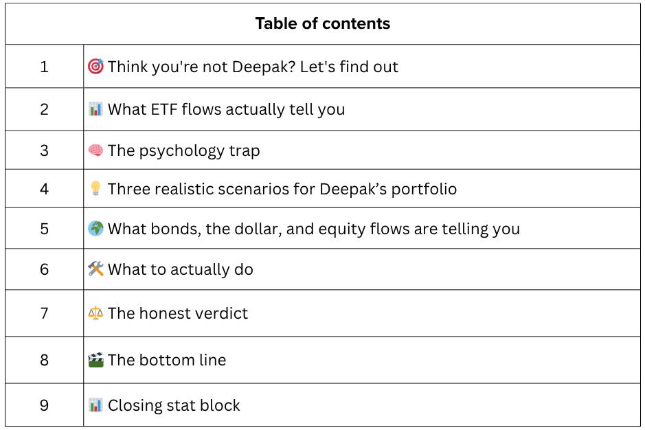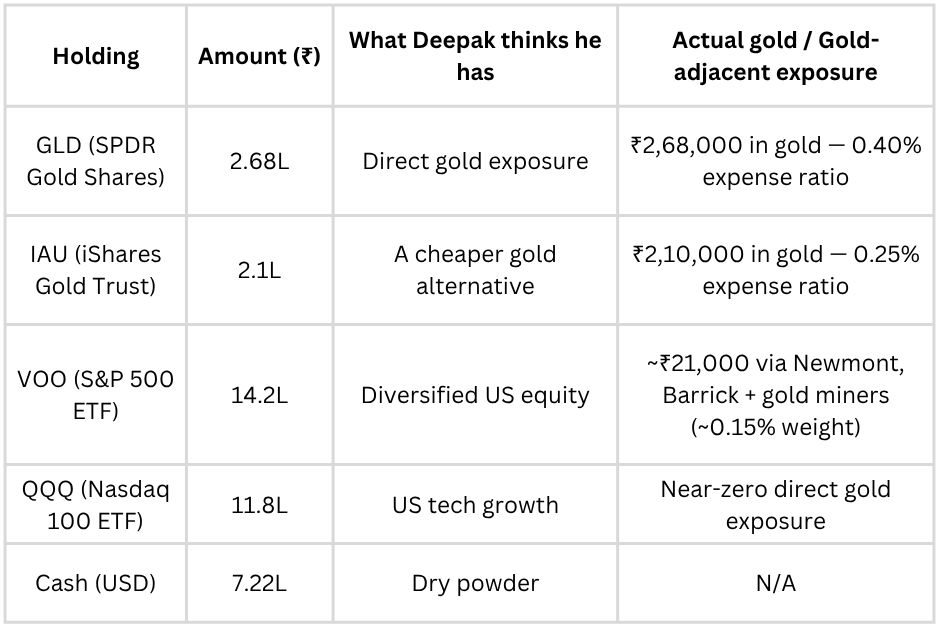 Now gold is at record-high territory but has pulled back from January peaks; his GLD position is up roughly 22%, and his investing-circle notifications are relentless. He’s seriously considering adding ₹3–₹ 4 lakh more. Here’s what Deepak thinks he owns versus what he actually owns:
