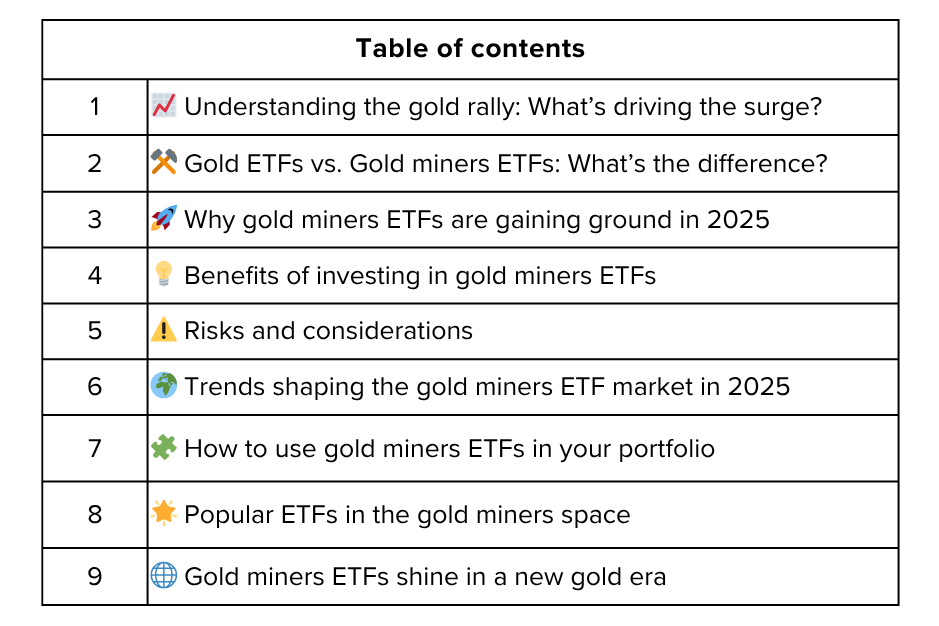 Gold has been the standout performer of 2025, with prices surging to record highs and outpacing major equity indices115. This rally has reignited interest in gold-related investments, particularly Gold Miners ETFs, which offer a dynamic way to capitalize on the precious metals boom. As investors seek both growth and portfolio defense amid inflation, geopolitical risk, and market volatility, Gold Miners ETFs are emerging as a powerful tool. In this article, we’ll explore why these ETFs are gaining traction, how they work, the unique benefits and risks, and which funds are leading the way in 2025.