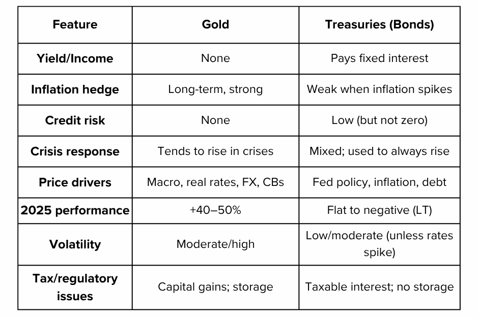In today’s world, gold and Treasuries are no longer perfect substitutes. Each has a place depending on your risk, income needs, views on inflation, and sensitivity to currency/fiscal policy shifts.