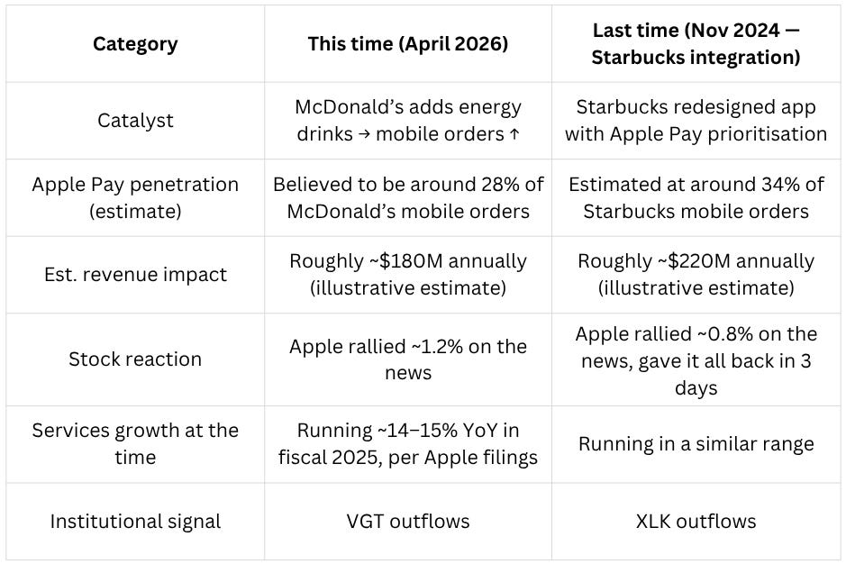 The McDonald’s mobile payment angle? It’s a rounding error. Apple’s Services segment generated approximately $109.2B in revenue in fiscal 2025, per Apple’s October 2025 earnings. Even if McDonald’s mobile orders grew significantly and Apple Pay captured all of the incremental volume (it won’t), we’re talking about an extra ~$180M in annual payment processing fees — roughly ~0.16% of Services revenue.