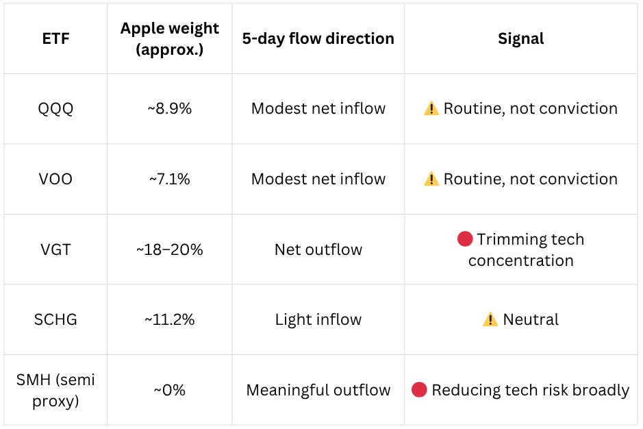 But VGT (tech-focused) is seeing outflows despite Apple being its largest holding. That’s a divergence. When the most concentrated tech fund sees outflows while broader indexes drift up, institutions are saying: “We’ll own Apple through the index, but we’re not making an active bet on tech.”