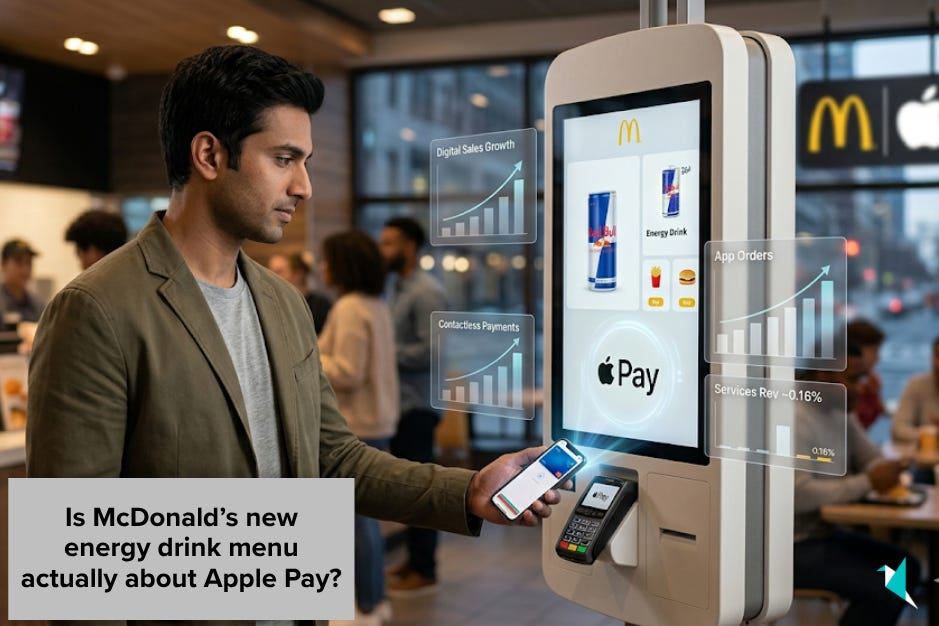 McDonald's just announced it's adding Red Bull energy drinks and craft sodas to its U.S. menu — and somehow the stock everyone's talking about is Apple. The financial press is fixating on Apple Inc. as the primary angle here: more energy drinks means younger, app-first customers ordering more often, which means more Apple Pay volume, and Apple takes an estimated 0.15% cut of every contactless transaction run through issuing banks. Apple stock popped roughly 1.2% yesterday on this theory.