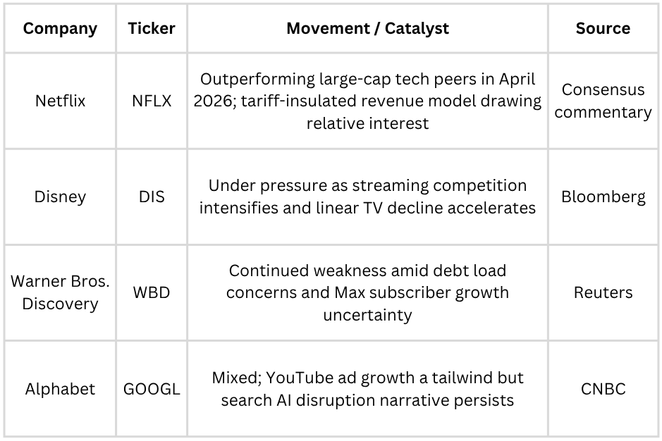 Note: NFLX has shown notable resilience relative to most large-cap technology names through April 2026’s volatile tape. Its software-only revenue model offers a relative shelter from tariff-driven volatility compared with hardware-heavy peers—though this is an inference from Netflix’s business mix rather than management attribution. Price levels referenced throughout are approximate, drawn from guidance and consensus analysis. Exact share prices vary by session.