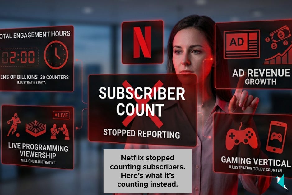The subscriber era is over: Netflix stopped reporting quarterly subscriber numbers beginning with Q1 2025, after announcing the change in its Q1 2024 shareholder letter, shifting analyst attention toward revenue per member, total engagement hours, and advertising revenue growth. Management’s view: engagement and monetisation are more accurate proxies for business health than raw headcount.