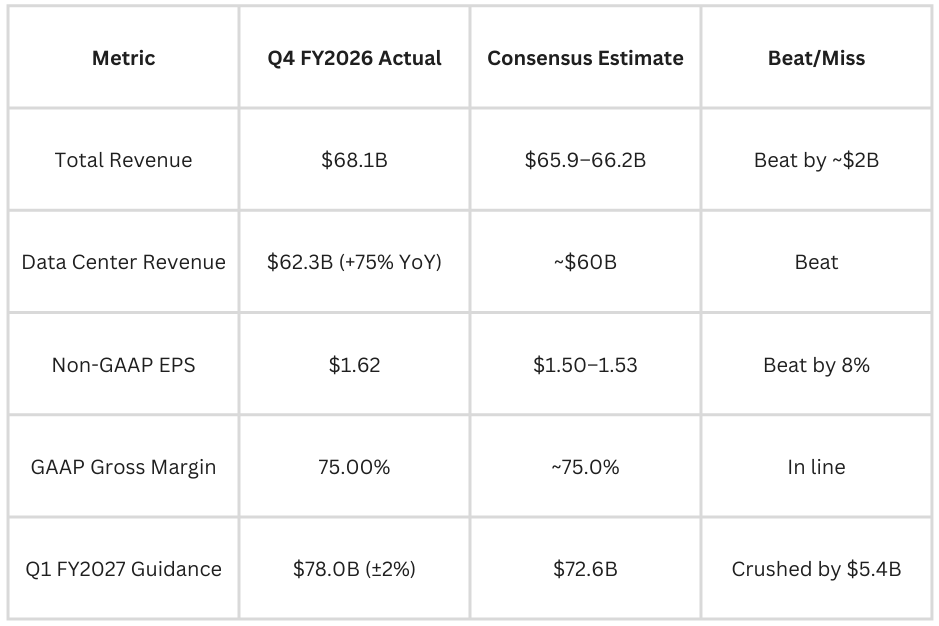 NVIDIA just delivered one of the most dominant earnings reports in corporate history. Revenue of $68.1 billion, up 73% year-over-year. Data centre revenue of $62.3 billion, up 75%. Non-GAAP EPS of $1.62 versus the Street’s $1.50. Next-quarter guidance of $78 billion, crushing the consensus of $72.6 billion by more than $5 billion. Net income for the quarter hit $43 billion—that is, $330 million per day. And the stock fell by more than 5% the next morning, wiping out roughly $260 billion in market value in a single session.