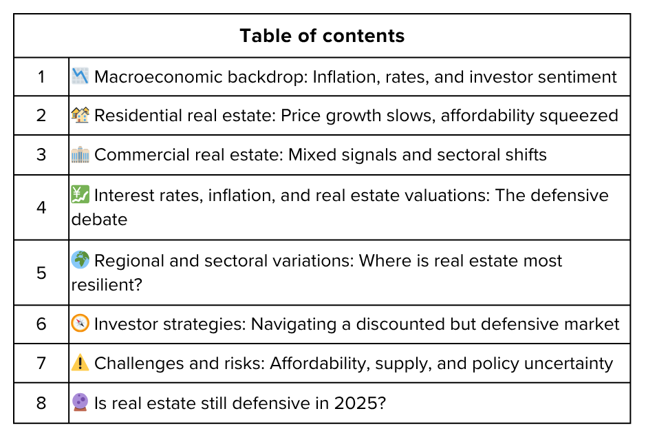 In 2025, the real estate sector finds itself at a fascinating intersection. After years of price surges, market shocks, and shifting consumer behaviour, property markets across the globe are showing signs of both resilience and vulnerability. High interest rates, persistent inflation, and global economic uncertainty have led to a “discounted” feel in valuations, yet the sector’s defensive qualities—steady cash flows, tangible assets, and long-term demand—continue to attract investors seeking stability. Is real estate still a defensive play, or are there deeper risks beneath the surface? This article explores the trends, challenges, and opportunities shaping real estate in 2025.