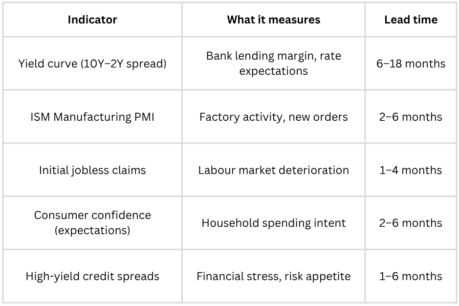 Leading indicators move before the economy turns. Yield curve, LEI, manufacturing PMI, consumer expectations, credit spreads — these are all leading. They’re noisier and less certain, but they give you early warning.