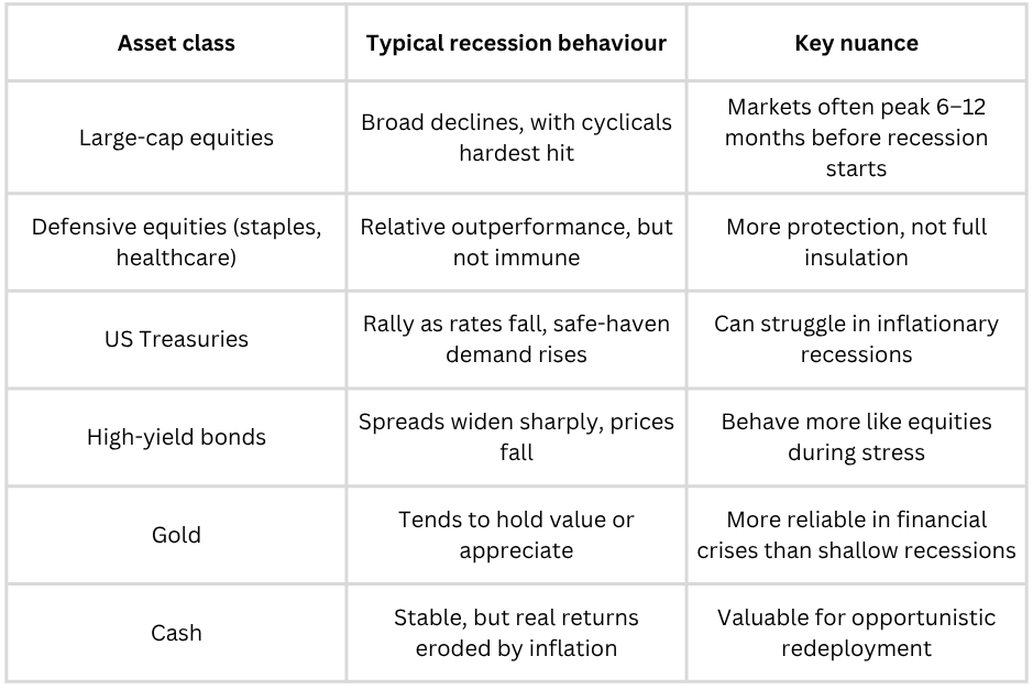 Not all assets react the same way when the economy contracts. Understanding the historical playbook helps you think about positioning — even if no two recessions are identical.
