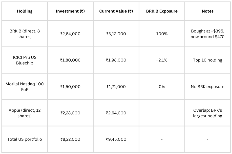 Priya’s hidden reality: She thinks she owns ₹3.12 lakh of Berkshire. But she actually has ₹3.16 lakh in BRK.B exposure when you account for fund overlap. More importantly, she owns ₹2.64 lakh of Apple directly — and Apple is Berkshire’s largest equity holding, often around 20–30% of its public stock portfolio by value in recent filings.