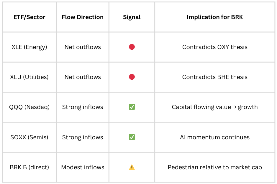 BRK.B’s own inflows are modest relative to its roughly $950 billion market cap — tiny compared to the percentage-of-market-cap flows going into names like NVDA or even XOM.