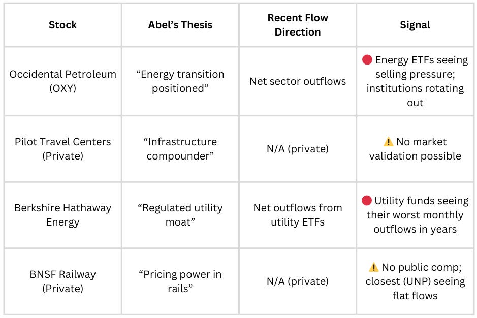 Berkshire isn’t heavily owned through thematic ETFs (it’s too unique), but the stocks Abel highlighted in his letter are flowing in different directions. This tells you whether the market actually agrees with his “compounder” thesis.