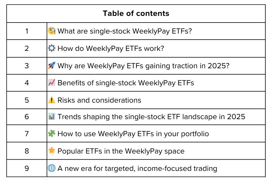 The ETF landscape is constantly evolving, and 2025 has brought one of the most innovative products yet: Single-stock WeeklyPay ETFs. These funds are rewriting the rules for targeted exposure, combining the excitement of single-stock investing with the structure and accessibility of ETFs—plus a twist: weekly income distributions and leveraged returns. As traders and income-seekers look for new ways to capture opportunity in today’s fast-moving markets, WeeklyPay ETFs are quickly gaining attention. In this article, we’ll explore what makes these ETFs unique, how they work, their benefits and risks, and what investors should know before jumping in.