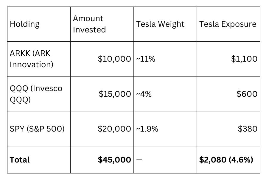 Add direct Tesla shares to this portfolio, and exposure easily exceeds 8-10% without the investor explicitly intending such concentration.