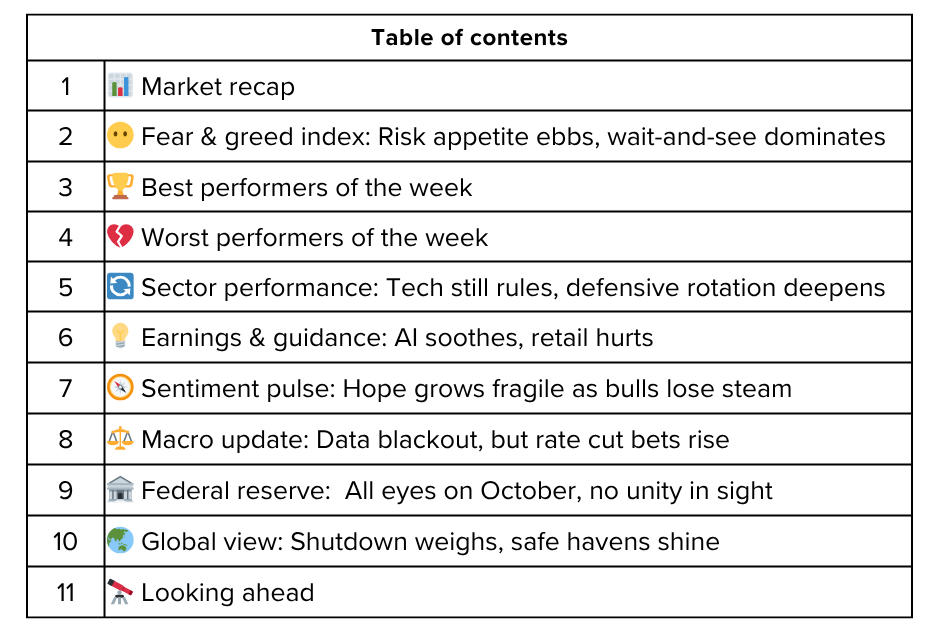 Wall Street strode through the second week of October with mixed emotions, as the market’s high-wire act continued against a uniquely American backdrop—historic highs in AI and tech, a 10-day (and counting) government shutdown, renewed inflation anxiety, and deepening rifts inside the Federal Reserve. The post-summer “hope trade” is fraying at the edges: traders are buying every AI dip, but the rest of the tape is trading defensively as uncertainty mounts.