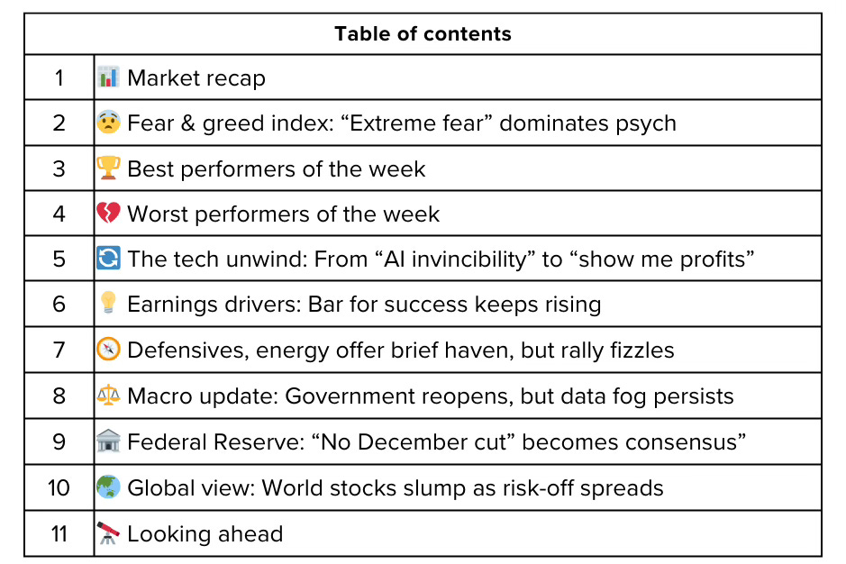 Wall Street’s wild November ride grew hair-raising this week as relief from Washington’s shutdown drama gave way to turbulence on the trading desk. Stocks were pummeled by disappointing tech earnings, relentless concerns about overvaluation in artificial intelligence, and a fresh spike in “extreme fear” readings from the CNN Fear & Greed Index. Even as the S&P 500 , Dow , and Nasdaq tried to find support, a bruising rout in mega-cap technology names left investors bracing for an uncertain close to 2025.
