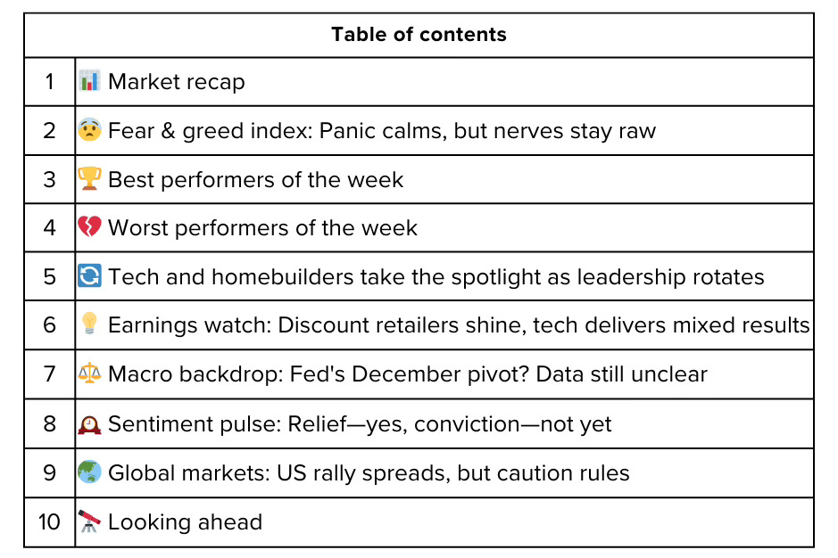 Wall Street’s final full week of November saw a massive reversal rally into Thanksgiving, but all the turkey and shopping optimism wasn’t enough to erase the month’s bruises. Major indices ended with strong weekly gains—helped by fresh dovish hints from the Fed and a round of robust retail earnings—but the month’s theme remained damage control, not celebration. Underneath the Thanksgiving bounce, battered tech, rate-sensitive cyclicals, and shifting macro signals kept investors on edge and “fear” firmly in play.
