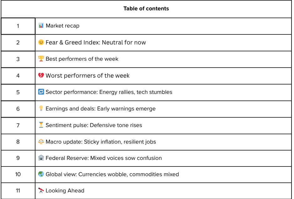 Wall Street entered October on shaky footing after September’s late pullback, with all three major indexes continuing their losing streaks. A combination of sticky inflation data, mixed Fed messaging, and renewed trade anxieties kept volatility elevated. Sector rotations remained sharp, with defensives fading, energy rallying, and tech wobbling under earnings warnings. Investors are bracing for October’s notorious volatility as Q3 closes and earnings season prepares to kick off.