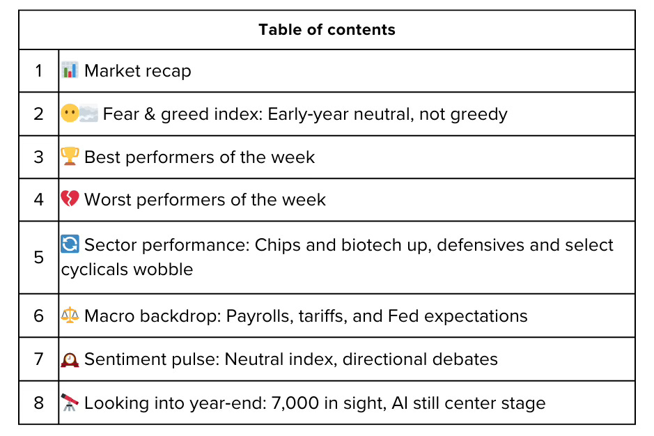 The first full trading week of 2026 felt like a classic “macro overhang” market. Stocks managed to grind higher overall, but every uptick had to fight through headlines about Friday’s crucial payrolls report, a looming Supreme Court ruling on President Trump’s new tariff regime, and a dollar and yield spike that kept growth investors on edge. The S&P 500 [finance:S&P 500] is up roughly 0.9% week‑to‑date, while the Dow Jones Industrial Average [finance:Dow Jones Industrial Average] and Nasdaq Composite [finance:Nasdaq Composite] have jumped about 1.8% and 1.1% respectively, keeping all three benchmarks within reach of their late‑2025 record highs.
