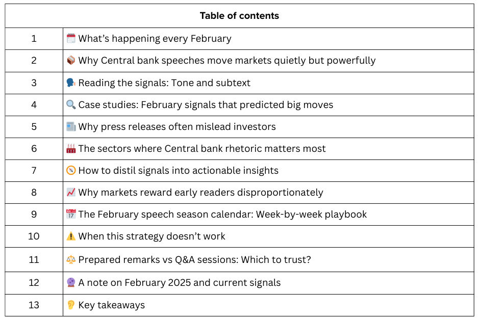 Time arbitrage opportunity: Sophisticated investors dedicate analysts to parsing this content immediately. You can capture much of the same insight by spending 2–3 hours per week during February’s speech season on the central banks relevant to your portfolio.