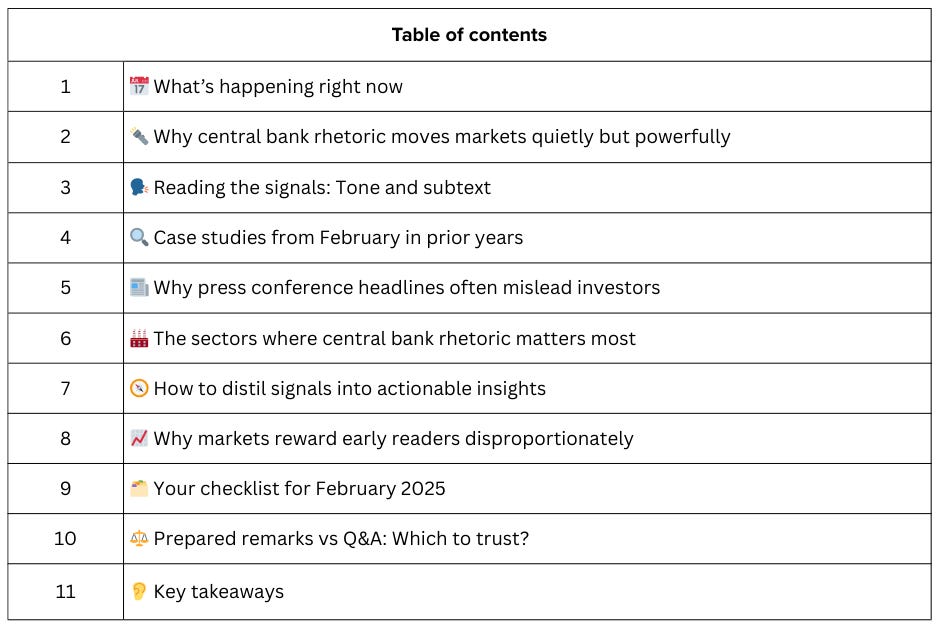 Every February, markets obsess over rate decisions while ignoring the real alpha: what central bankers say when they think no one’s listening. This month, as the Fed chair prepares for semi-annual Congressional testimony and ECB officials scatter across European finance conferences, the gap between official statements and casual remarks is widening in ways that deserve close attention.