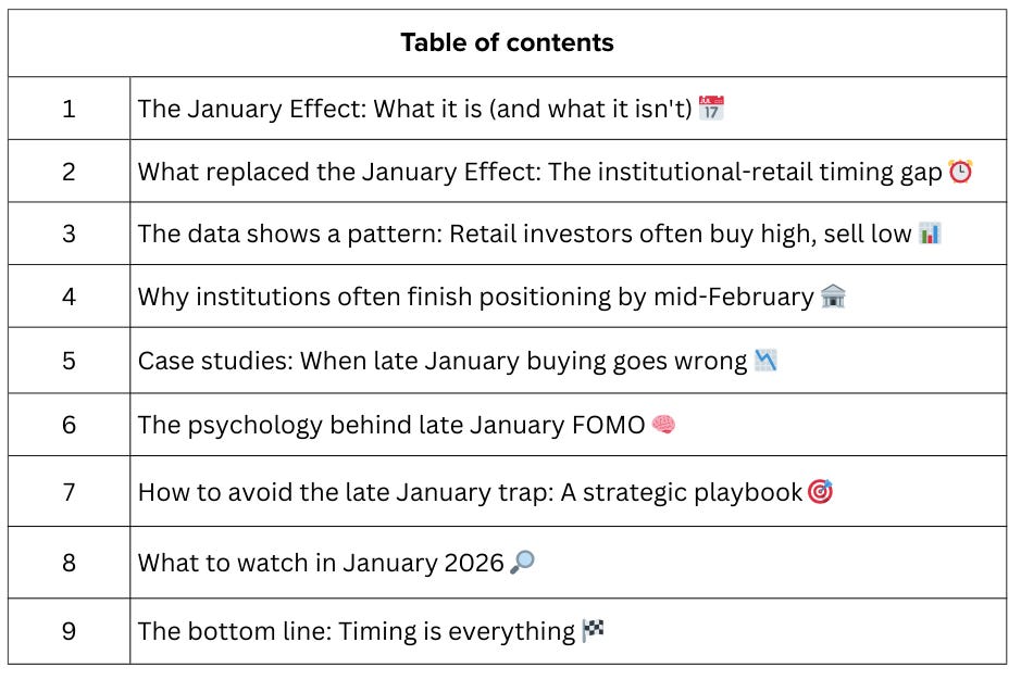The January Effect of the 1940s-1980s has significantly weakened. What often appears in its place is more subtle: a timing gap between institutional positioning (typically early January) and retail FOMO (often late January).